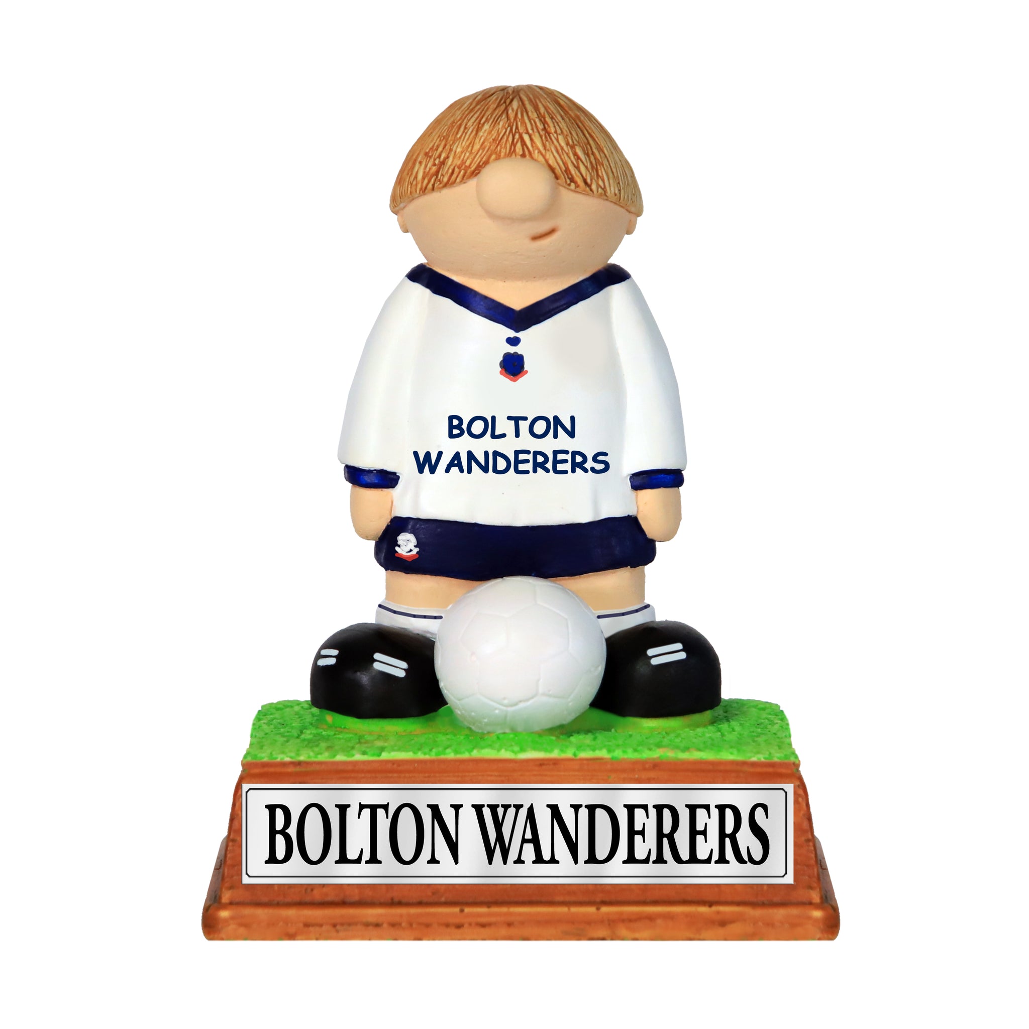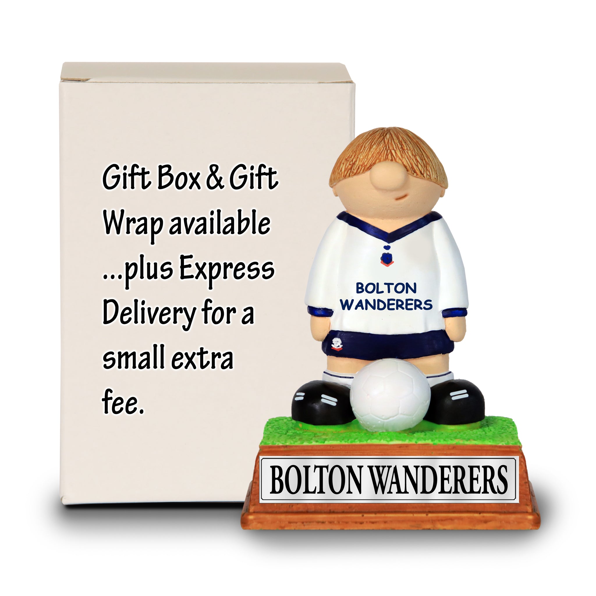 The perfect personalised gift for that special fan of Bolton Wanderers FC ! Your mini Bolton Wanderers football figure can be personalised with a name and number of your choice on the back fo the shirt as well as the skin tone and hair colour required. A unique football gift !!!